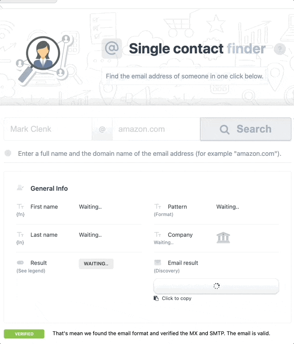 Find emails with just a name + company.- Upload large CSV files and find verified emails in seconds